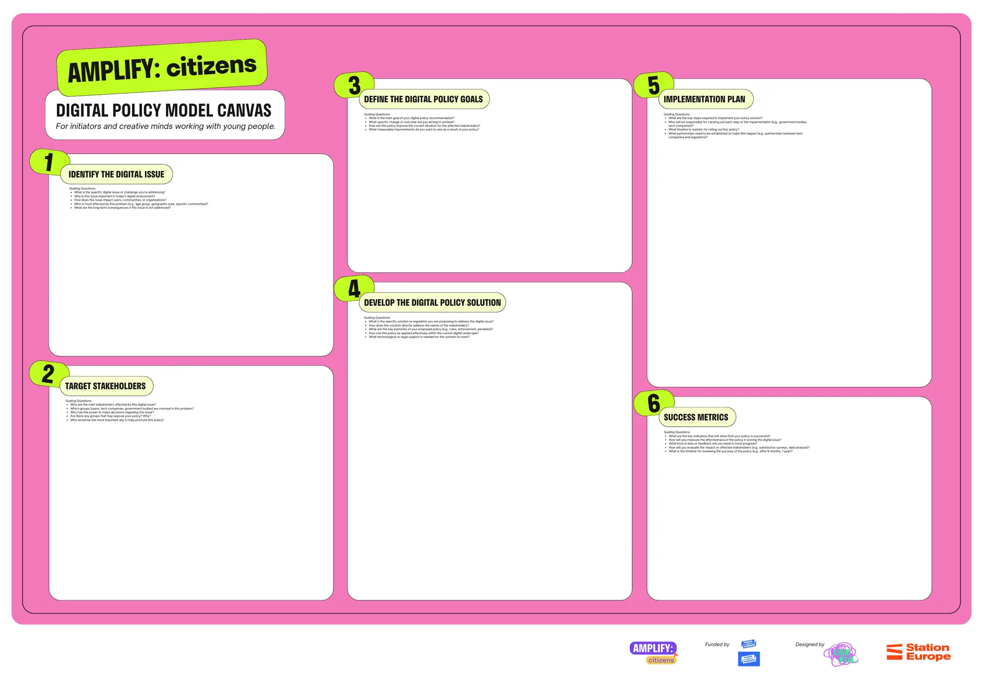 Transform ideas into real policy recommendations with our Digital Policy Model Canvas. This structured framework guides young people through six key steps to co-create digital policies that are actionable.